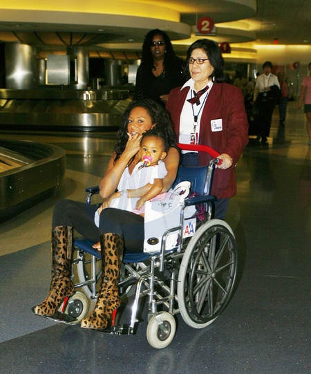 Melanie Brown przybywa na lotnisko na wozku inwalidzkim w Los Angeles
