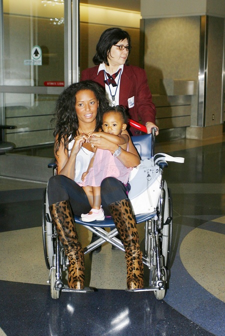 Melanie Brown przybywa na lotnisko na wozku inwalidzkim w Los Angeles