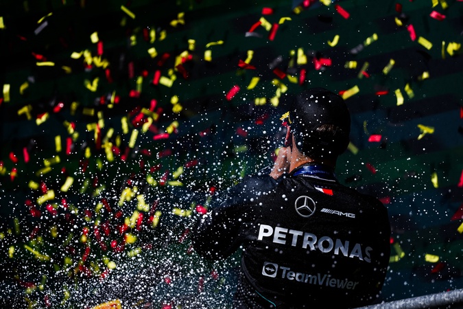 DPPI - George Russell remporte le grand prix de Belgique de Formule 1 (F1) à Spa-Francorchamps - RUSSELL George (gbr), Mercedes AMG F1 Team W15, celebrating the race win during the Formula 1 Rolex Belgian Grand Prix 2024, 14th round of the 2024 Formula One World Championship from July 26 to 28, 2024 on the Circuit de Spa-Francorchamps, in Stavelot, Belgium -