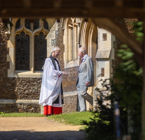 Pictured Reverend Canon Paul Williams and the King. His Majesty King Charles III Leaves Sunday Service in the Grounds of Sandringham House., Mary Magdalene Church, Sandringham Sunday 28 July 2024., Credit:Terry Harris / Avalon