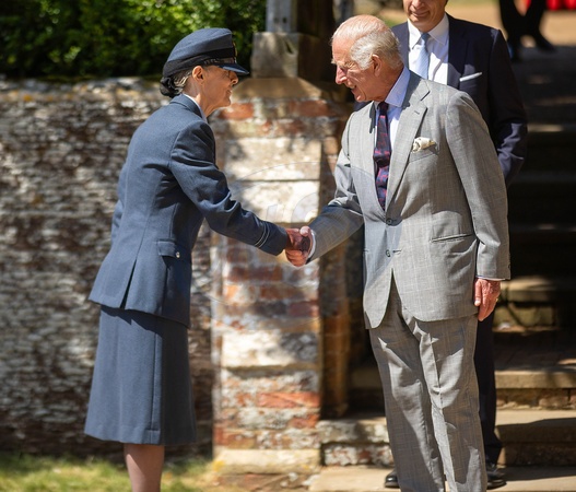 Pictured The Kings Greets Flight lieutenant Pauline Petch who has overseen 42F (King's Lynn, Estate 1939 ) Squadron Air Training Corps Venture Adventure for 20 years. His Majesty King Charles III Leaves Sunday Service in the Grounds of Sandringham House., Mary Magdalene Church, Sandringham Sunday 28 July 2024., Credit:Terry Harris / Avalon