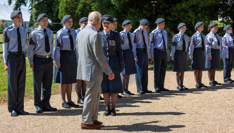 Pictured The Kings Greets Flight lieutenant Pauline Petch who has overseen 42F (King's Lynn, Estate 1939 ) Squadron Air Training Corps Venture Adventure for 20 years. His Majesty King Charles III Leaves Sunday Service in the Grounds of Sandringham House., Mary Magdalene Church, Sandringham Sunday 28 July 2024., Credit:Terry Harris / Avalon
