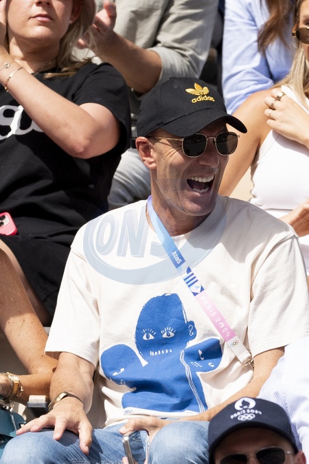 Zinédine Zidane et sa femme Véronique assistent à l'épreuve de tennis (Rafael Nadal) lors des Jeux Olympiques de Paris 2024 (JO) à Roland Garros, à Paris, France, le 28 juillet 2024. © Jacovides-Perusseau/Bestimage Zinedine Zidane and his wife Veronique attend the tennis event (Rafael Nadal) during the Paris 2024 Olympic Games (Olympics) at Roland Garros, in Paris, France, July 28, 2024.