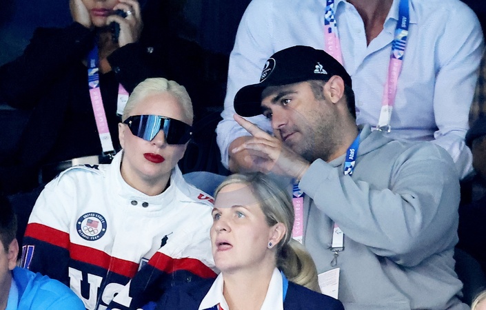 Lady Gaga i jej narzeczony Michael Polansky biorą udział w zwycięstwie Léona Marchanda w biegu na 400 m stylem zmiennym podczas Igrzysk Olimpijskich w Paryżu w 2024 r. (OG) w Paris La Defense Arena w Nanterre