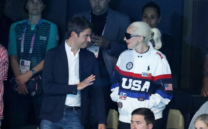 Gabriel Attal et Lady Gaga - Lady Gaga et son fiancé Michael Polansky assistent à la victoire de Léon Marchand sur 400 m 4 nage lors des Jeux Olympiques de Paris 2024 (JO) à Paris La Defense Arena à Nanterre le 28 juillet 2024. © Dominique Jacovides-Pierre Perusseau/Bestimage Lady Gaga and her fiancé Michael Polansky attend Léon Marchand's victory in the 400m medley during the Paris 2024 Olympic Games (Olympics) at Paris La Defense Arena in Nanterre on July 28, 2024.