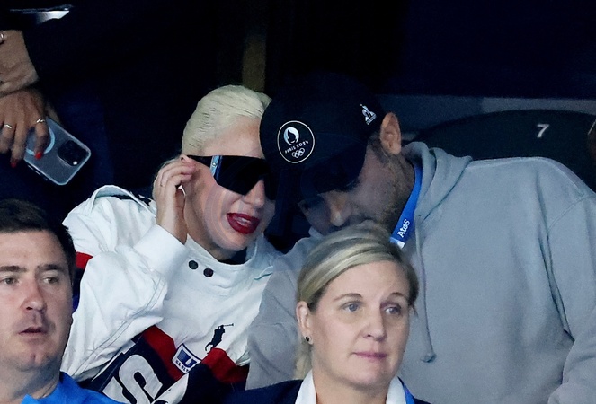 Lady Gaga i jej narzeczony Michael Polansky biorą udział w zwycięstwie Léona Marchanda w biegu na 400 m stylem zmiennym podczas Igrzysk Olimpijskich w Paryżu w 2024 r. (OG) w Paris La Defense Arena w Nanterre