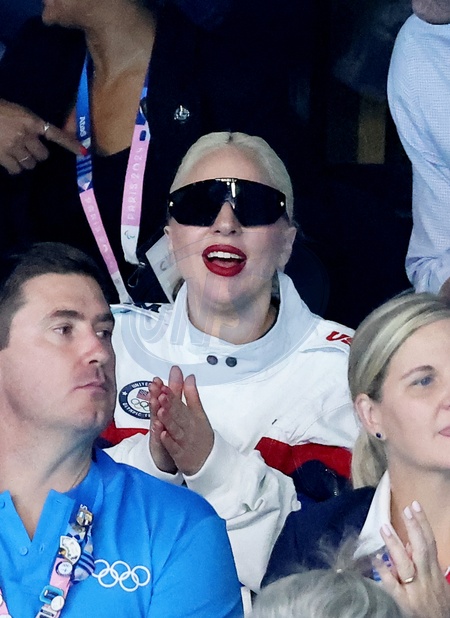 Lady Gaga et son fiancé Michael Polansky assistent à la victoire de Léon Marchand sur 400 m 4 nage lors des Jeux Olympiques de Paris 2024 (JO) à Paris La Defense Arena à Nanterre