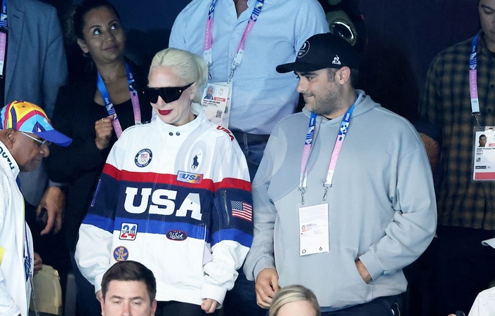 Lady Gaga i jej narzeczony Michael Polansky biorą udział w zwycięstwie Léona Marchanda w biegu na 400 m stylem zmiennym podczas Igrzysk Olimpijskich w Paryżu w 2024 r. (OG) w Paris La Defense Arena w Nanterre