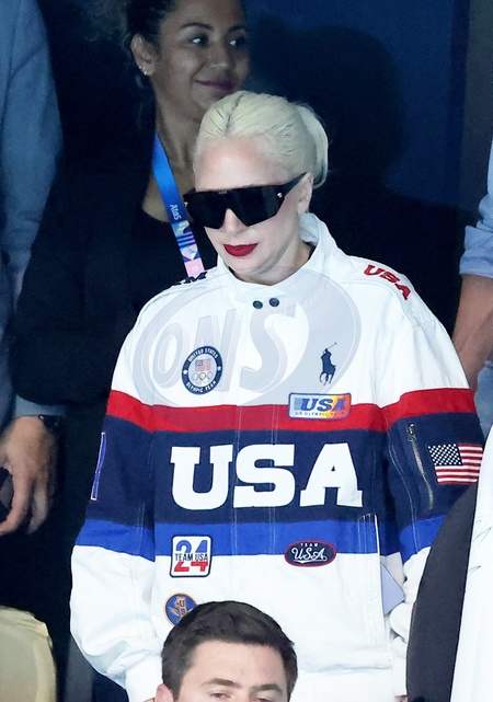 Lady Gaga et son fiancé Michael Polansky assistent à la victoire de Léon Marchand sur 400 m 4 nage lors des Jeux Olympiques de Paris 2024 (JO) à Paris La Defense Arena à Nanterre
