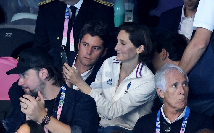 Gabriel Attal et Amélie Oudéa-Castéra - Célébrités assistent à la victoire de Léon Marchand qui devient champion Olympique sur 400 m 4 nages lors des Jeux Olympiques de Paris 2024 (JO) à Paris La Defense Arena à Nanterre le 28 juillet 2024. © Dominique Jacovides-Pierre Perusseau/Bestimage Celebrities attend the victory of Léon Marchand who becomes Olympic champion in the 400m medley during the Paris 2024 Olympic Games (Olympics) at Paris La Defense Arena in Nanterre on July 28, 2024