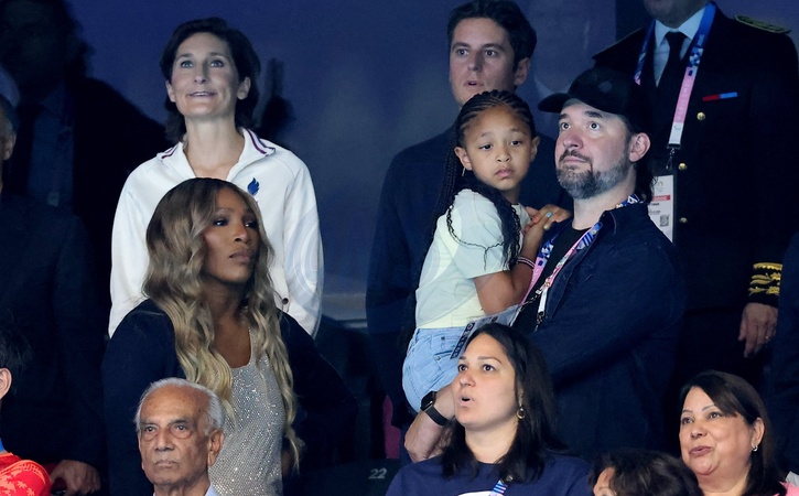 Merci de flouter le visage des enfants avant publication - Serena Williams, sa fille Olympia et son mari Alexis Ohanian, Gabriel Attal et Amélie Oudéa-Castéra - Célébrités assistent à la victoire de Léon Marchand qui devient champion Olympique sur 400 m 4 nages lors des Jeux Olympiques de Paris 2024 (JO) à Paris La Defense Arena à Nanterre le 28 juillet 2024. © Dominique Jacovides-Pierre Perusseau/Bestimage Celebrities attend the victory of Léon Marchand who becomes Olympic champion in the 400m medley during the Paris 2024 Olympic Games (Olympics) at Paris La Defense Arena in Nanterre on July 28, 2024