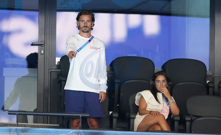 Antoine Griezmann et sa femme Erika Choperena - Célébrités assistent à la victoire de Léon Marchand qui devient champion Olympique sur 400 m 4 nages lors des Jeux Olympiques de Paris 2024 (JO) à Paris La Defense Arena à Nanterre le 28 juillet 2024. © Dominique Jacovides-Pierre Perusseau/Bestimage Celebrities attend the victory of Léon Marchand who becomes Olympic champion in the 400m medley during the Paris 2024 Olympic Games (Olympics) at Paris La Defense Arena in Nanterre on July 28, 2024