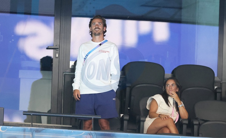 Antoine Griezmann et sa femme Erika Choperena - Célébrités assistent à la victoire de Léon Marchand qui devient champion Olympique sur 400 m 4 nages lors des Jeux Olympiques de Paris 2024 (JO) à Paris La Defense Arena à Nanterre le 28 juillet 2024. © Dominique Jacovides-Pierre Perusseau/Bestimage Celebrities attend the victory of Léon Marchand who becomes Olympic champion in the 400m medley during the Paris 2024 Olympic Games (Olympics) at Paris La Defense Arena in Nanterre on July 28, 2024