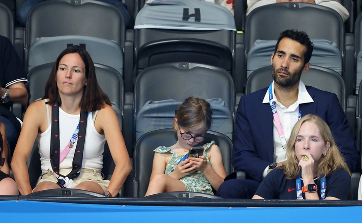 Merci de flouter le visage des enfants avant publication - Martin Fourcade en famille - Célébrités assistent à la victoire de Léon Marchand qui devient champion Olympique sur 400 m 4 nages lors des Jeux Olympiques de Paris 2024 (JO) à Paris La Defense Arena à Nanterre le 28 juillet 2024. © Dominique Jacovides-Pierre Perusseau/Bestimage Celebrities attend the victory of Léon Marchand who becomes Olympic champion in the 400m medley during the Paris 2024 Olympic Games (Olympics) at Paris La Defense Arena in Nanterre on July 28, 2024