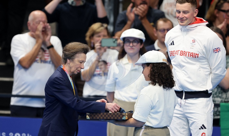 La princesse Anne - Célébrités assistent à la victoire de Léon Marchand qui devient champion Olympique sur 400 m 4 nages lors des Jeux Olympiques de Paris 2024 (JO) à Paris La Defense Arena à Nanterre le 28 juillet 2024. © Dominique Jacovides-Pierre Perusseau/Bestimage Celebrities attend the victory of Léon Marchand who becomes Olympic champion in the 400m medley during the Paris 2024 Olympic Games (Olympics) at Paris La Defense Arena in Nanterre on July 28, 2024