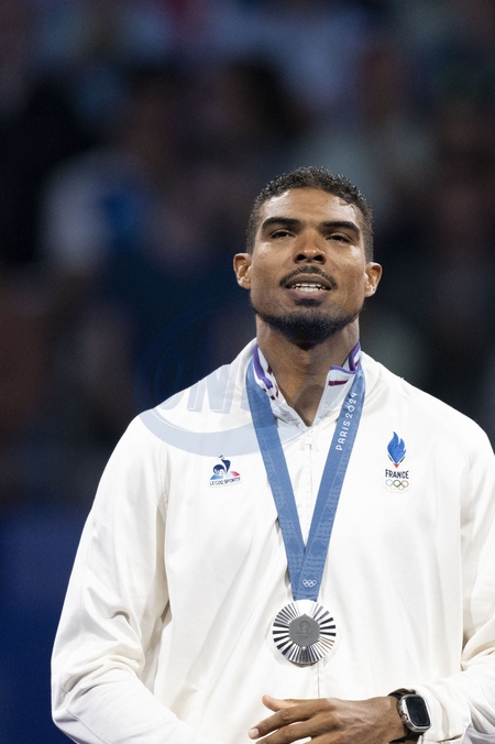 Yannick Borel - Yannick Borel remporte la médaille d'argent en epée individuelle après s'être incliné en finale contre le Japonais Koki Kano, N.3 mondial (15 touches à 9) ors des Jeux Olympiques de Paris 2024 (JO) à Paris le 28 juillet 2024. © Dominique Jacovides-Pierre Perusseau/Bestimage Yannick Borel wins the silver medal in individual epee after losing in the final against the Japanese Koki Kano, world No. 3 (15 touches to 9) at the Paris 2024 Olympic Games (OG) in Paris on July 28, 2024.