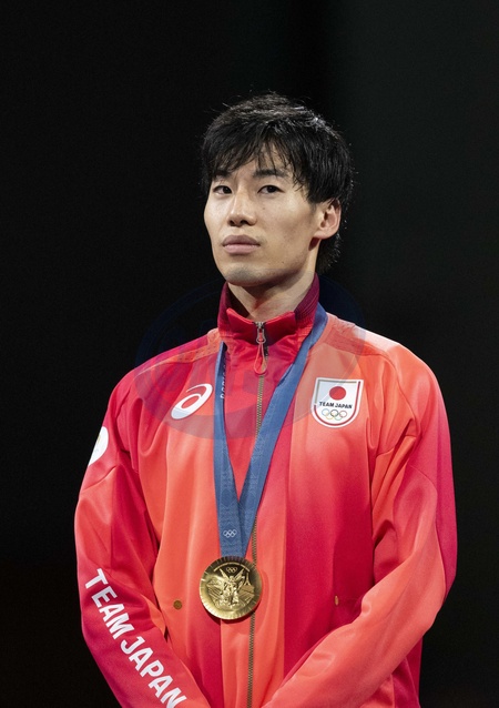 Kōki Kanō - Yannick Borel remporte la médaille d'argent en epée individuelle après s'être incliné en finale contre le Japonais Koki Kano, N.3 mondial (15 touches à 9) ors des Jeux Olympiques de Paris 2024 (JO) à Paris le 28 juillet 2024. © Dominique Jacovides-Pierre Perusseau/Bestimage Yannick Borel wins the silver medal in individual epee after losing in the final against the Japanese Koki Kano, world No. 3 (15 touches to 9) at the Paris 2024 Olympic Games (OG) in Paris on July 28, 2024.