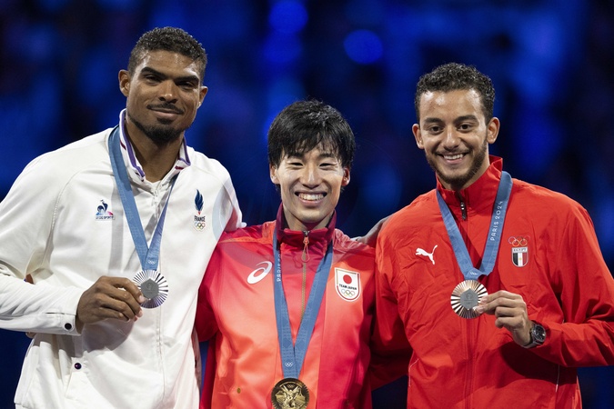 Yannick Borel, Kōki Kanō et Mohamed Elsayed - Yannick Borel remporte la médaille d'argent en epée individuelle après s'être incliné en finale contre le Japonais Koki Kano, N.3 mondial (15 touches à 9) ors des Jeux Olympiques de Paris 2024 (JO) à Paris le 28 juillet 2024. © Dominique Jacovides-Pierre Perusseau/Bestimage Yannick Borel wins the silver medal in individual epee after losing in the final against the Japanese Koki Kano, world No. 3 (15 touches to 9) at the Paris 2024 Olympic Games (OG) in Paris on July 28, 2024.