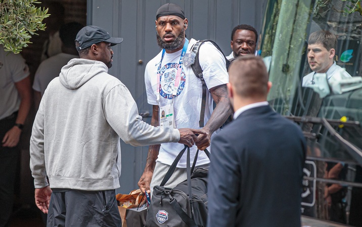 Lebron James i członkowie amerykańskiej drużyny koszykówki opuszczają hotel „L'Hermitage Gantois” w Lille z okazji Igrzysk Olimpijskich Paryż 2024