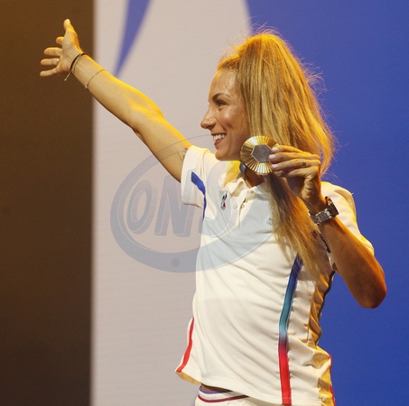 Pauline Ferrand-Prévot, médaille d'or en VTT, au Club France lors des Jeux Olympiques Paris 2024. Le 28 juillet 2024 © Jonathan Rebboah / Panoramic / Bestimage Pauline Ferrand-Prévot, gold medal in MTB, at the Club France during the Olympic Games Paris 2024. July 28, 2024