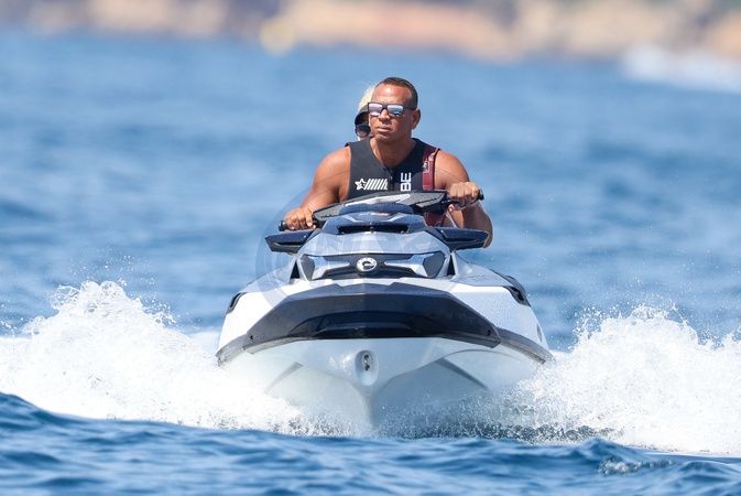 Exclusif - No web - Alex Rodriguez avec sa compagne Jaclyn Cordeiro et ses enfants sur un yacht près de Cannes le 28 juillet 2024. Au programme : séance jet ski et baignade. Exclusive - For Germany call for price - No web - Alex Rodriguez with his partner Jaclyn Cordeiro and his children on a yacht near Cannes on July 28, 2024. On the program: jet ski session and swimming.