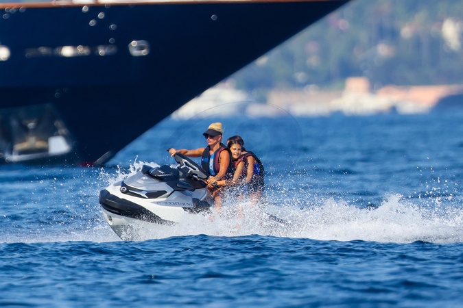 Exclusif - No web - Alex Rodriguez avec sa compagne Jaclyn Cordeiro et ses enfants sur un yacht près de Cannes le 28 juillet 2024. Au programme : séance jet ski et baignade. Exclusive - For Germany call for price - No web - Alex Rodriguez with his partner Jaclyn Cordeiro and his children on a yacht near Cannes on July 28, 2024. On the program: jet ski session and swimming.
