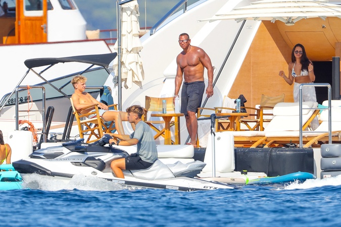 Exclusif - No web - Alex Rodriguez avec sa compagne Jaclyn Cordeiro et ses enfants sur un yacht près de Cannes le 28 juillet 2024. Au programme : séance jet ski et baignade. Exclusive - For Germany call for price - No web - Alex Rodriguez with his partner Jaclyn Cordeiro and his children on a yacht near Cannes on July 28, 2024. On the program: jet ski session and swimming.