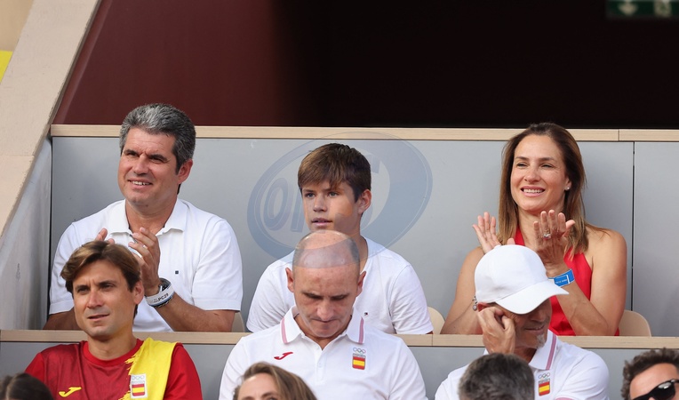 Carlos et Virginia Alcaraz (parents de Carlos Alcaraz) avec leur fils Jaime - People assistent à la victoire de Carlos Alcaraz face à Tallon Griekspoor 6-1, 7-6 (7/3) sur le Court Philippe-Chatrier de Roland-Garros à Paris lors des Jeux Olympiques de Paris2024 (JO) le 29 juillet 2024. © Jacovides-Perusseau/Bestimage People attend Carlos Alcaraz's victory over Tallon Griekspoor 6-1, 7-6 (7/3) on Court Philippe-Chatrier at Roland-Garros in Paris during the Paris2024 Olympic Games (Olympics) on July 29, 2024.