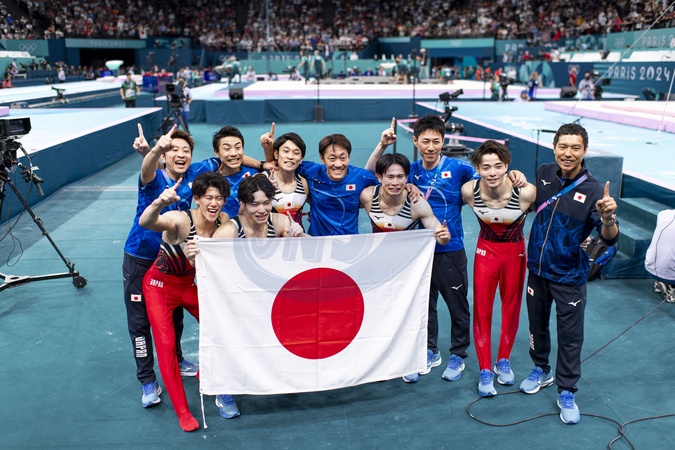 Les Japonais sacrés champions olympiques du concours général par équipes lors des Jeux Olympique Paris 2024, le 29 juillet 2024 à Paris. - Célébrités assistent aux épreuves de gymnastiques lors des Jeux Olympiques de Paris 2024 (JO) au Palais omnisports Bercy Arena, à Paris le 29 juillet 2024. © Jacovides-Perusseau/Bestimage Celebrities attend the gymnastics events during the Paris 2024 Olympic Games (Olympics) at Palais Omnisports Bercy Arena in Paris on July 29, 2024.