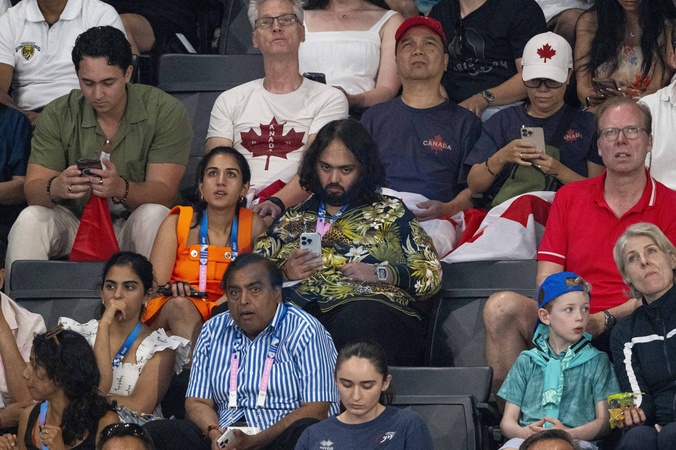 Exclusif - Anant Ambani avec sa femme et toute sa famille (Radhika Anant Ambani sa femme, Mukesh Ambani son pere, et sa mere Nita Ambani) - Célébrités assistent aux épreuves de gymnastique lors des Jeux Olympiques de Paris 2024 (JO) au Palais omnisports Bercy Arena, à Paris, France, le 30 juillet 2024. © Jacovides-Perusseau/Bestimage Exclusive - Anant Ambani with his wife and his entire family (Radhika Anant Ambani his wife, Mukesh Ambani his father, and his mother Nita Ambani) attend the gymnastics events during the Paris 2024 Olympic Games (Olympics) at Palais Omnisports Bercy Arena in Paris on July 30, 2024.
