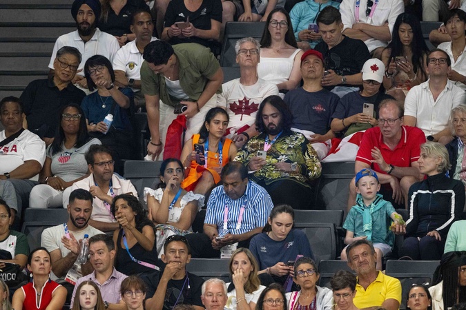 Exclusif - Anant Ambani avec sa femme et toute sa famille (Radhika Anant Ambani sa femme, Mukesh Ambani son pere, et sa mere Nita Ambani) - Célébrités assistent aux épreuves de gymnastique lors des Jeux Olympiques de Paris 2024 (JO) au Palais omnisports Bercy Arena, à Paris, France, le 30 juillet 2024. © Jacovides-Perusseau/Bestimage Exclusive - Anant Ambani with his wife and his entire family (Radhika Anant Ambani his wife, Mukesh Ambani his father, and his mother Nita Ambani) attend the gymnastics events during the Paris 2024 Olympic Games (Olympics) at Palais Omnisports Bercy Arena in Paris on July 30, 2024.