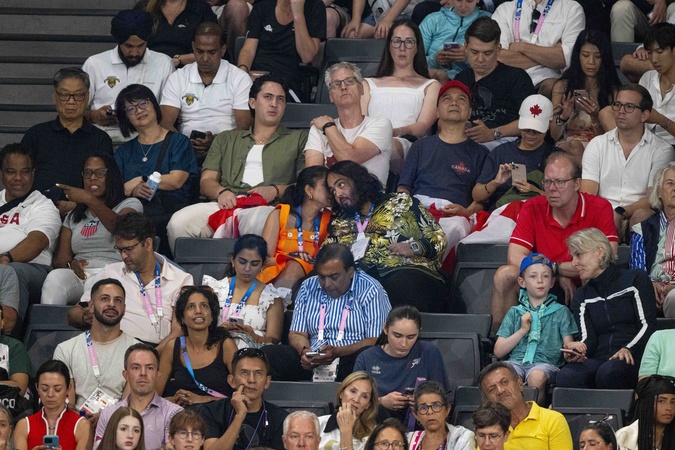 Exclusif - Anant Ambani avec sa femme et toute sa famille (Radhika Anant Ambani sa femme, Mukesh Ambani son pere, et sa mere Nita Ambani) - Célébrités assistent aux épreuves de gymnastique lors des Jeux Olympiques de Paris 2024 (JO) au Palais omnisports Bercy Arena, à Paris, France, le 30 juillet 2024. © Jacovides-Perusseau/Bestimage Exclusive - Anant Ambani with his wife and his entire family (Radhika Anant Ambani his wife, Mukesh Ambani his father, and his mother Nita Ambani) attend the gymnastics events during the Paris 2024 Olympic Games (Olympics) at Palais Omnisports Bercy Arena in Paris on July 30, 2024.