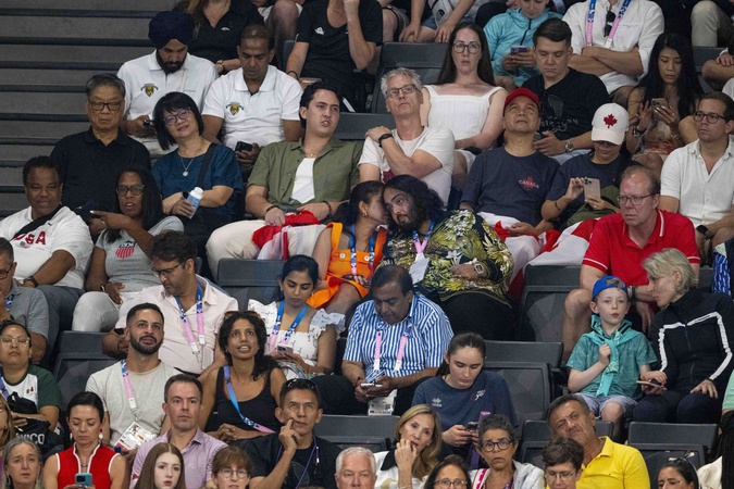 Exclusif - Anant Ambani avec sa femme et toute sa famille (Radhika Anant Ambani sa femme, Mukesh Ambani son pere, et sa mere Nita Ambani) - Célébrités assistent aux épreuves de gymnastique lors des Jeux Olympiques de Paris 2024 (JO) au Palais omnisports Bercy Arena, à Paris, France, le 30 juillet 2024. © Jacovides-Perusseau/Bestimage Exclusive - Anant Ambani with his wife and his entire family (Radhika Anant Ambani his wife, Mukesh Ambani his father, and his mother Nita Ambani) attend the gymnastics events during the Paris 2024 Olympic Games (Olympics) at Palais Omnisports Bercy Arena in Paris on July 30, 2024.