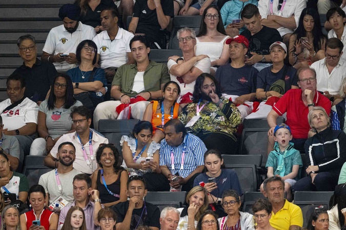 Exclusif - Anant Ambani avec sa femme et toute sa famille (Radhika Anant Ambani sa femme, Mukesh Ambani son pere, et sa mere Nita Ambani) - Célébrités assistent aux épreuves de gymnastique lors des Jeux Olympiques de Paris 2024 (JO) au Palais omnisports Bercy Arena, à Paris, France, le 30 juillet 2024. © Jacovides-Perusseau/Bestimage Exclusive - Anant Ambani with his wife and his entire family (Radhika Anant Ambani his wife, Mukesh Ambani his father, and his mother Nita Ambani) attend the gymnastics events during the Paris 2024 Olympic Games (Olympics) at Palais Omnisports Bercy Arena in Paris on July 30, 2024.