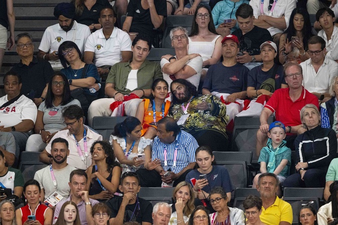 Exclusif - Anant Ambani avec sa femme et toute sa famille (Radhika Anant Ambani sa femme, Mukesh Ambani son pere, et sa mere Nita Ambani) - Célébrités assistent aux épreuves de gymnastique lors des Jeux Olympiques de Paris 2024 (JO) au Palais omnisports Bercy Arena, à Paris, France, le 30 juillet 2024. © Jacovides-Perusseau/Bestimage Exclusive - Anant Ambani with his wife and his entire family (Radhika Anant Ambani his wife, Mukesh Ambani his father, and his mother Nita Ambani) attend the gymnastics events during the Paris 2024 Olympic Games (Olympics) at Palais Omnisports Bercy Arena in Paris on July 30, 2024.