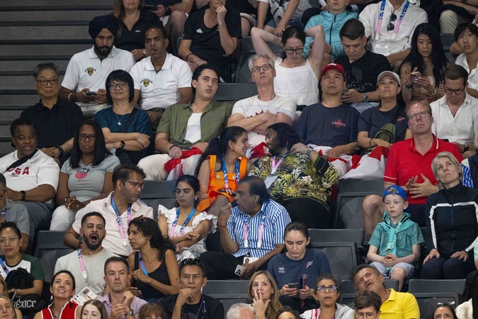 Exclusif - Anant Ambani avec sa femme et toute sa famille (Radhika Anant Ambani sa femme, Mukesh Ambani son pere, et sa mere Nita Ambani) - Célébrités assistent aux épreuves de gymnastique lors des Jeux Olympiques de Paris 2024 (JO) au Palais omnisports Bercy Arena, à Paris, France, le 30 juillet 2024. © Jacovides-Perusseau/Bestimage Exclusive - Anant Ambani with his wife and his entire family (Radhika Anant Ambani his wife, Mukesh Ambani his father, and his mother Nita Ambani) attend the gymnastics events during the Paris 2024 Olympic Games (Olympics) at Palais Omnisports Bercy Arena in Paris on July 30, 2024.