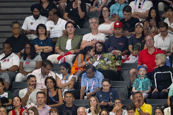Exclusif - Anant Ambani avec sa femme et toute sa famille (Radhika Anant Ambani sa femme, Mukesh Ambani son pere, et sa mere Nita Ambani) - Célébrités assistent aux épreuves de gymnastique lors des Jeux Olympiques de Paris 2024 (JO) au Palais omnisports Bercy Arena, à Paris, France, le 30 juillet 2024. © Jacovides-Perusseau/Bestimage Exclusive - Anant Ambani with his wife and his entire family (Radhika Anant Ambani his wife, Mukesh Ambani his father, and his mother Nita Ambani) attend the gymnastics events during the Paris 2024 Olympic Games (Olympics) at Palais Omnisports Bercy Arena in Paris on July 30, 2024.