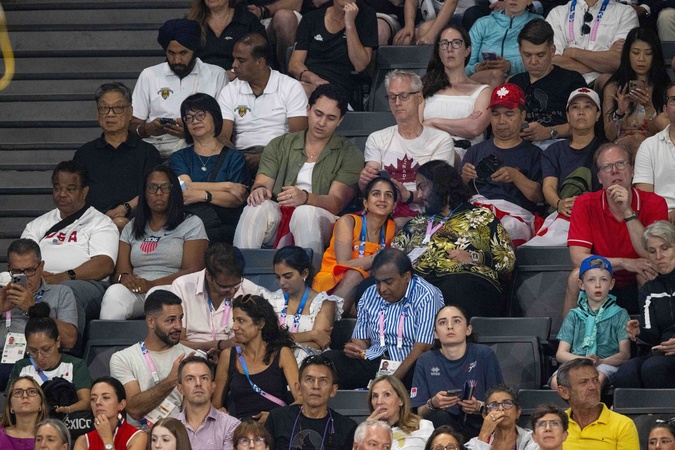 Exclusif - Anant Ambani avec sa femme et toute sa famille (Radhika Anant Ambani sa femme, Mukesh Ambani son pere, et sa mere Nita Ambani) - Célébrités assistent aux épreuves de gymnastique lors des Jeux Olympiques de Paris 2024 (JO) au Palais omnisports Bercy Arena, à Paris, France, le 30 juillet 2024. © Jacovides-Perusseau/Bestimage Exclusive - Anant Ambani with his wife and his entire family (Radhika Anant Ambani his wife, Mukesh Ambani his father, and his mother Nita Ambani) attend the gymnastics events during the Paris 2024 Olympic Games (Olympics) at Palais Omnisports Bercy Arena in Paris on July 30, 2024.