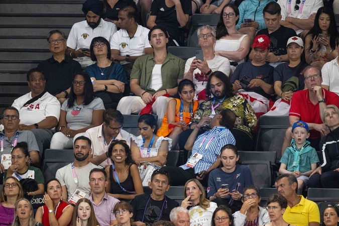 Exclusif - Anant Ambani avec sa femme et toute sa famille (Radhika Anant Ambani sa femme, Mukesh Ambani son pere, et sa mere Nita Ambani) - Célébrités assistent aux épreuves de gymnastique lors des Jeux Olympiques de Paris 2024 (JO) au Palais omnisports Bercy Arena, à Paris, France, le 30 juillet 2024. © Jacovides-Perusseau/Bestimage Exclusive - Anant Ambani with his wife and his entire family (Radhika Anant Ambani his wife, Mukesh Ambani his father, and his mother Nita Ambani) attend the gymnastics events during the Paris 2024 Olympic Games (Olympics) at Palais Omnisports Bercy Arena in Paris on July 30, 2024.