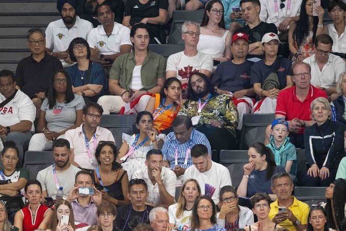 Exclusif - Anant Ambani avec sa femme et toute sa famille (Radhika Anant Ambani sa femme, Mukesh Ambani son pere, et sa mere Nita Ambani) - Célébrités assistent aux épreuves de gymnastique lors des Jeux Olympiques de Paris 2024 (JO) au Palais omnisports Bercy Arena, à Paris, France, le 30 juillet 2024. © Jacovides-Perusseau/Bestimage Exclusive - Anant Ambani with his wife and his entire family (Radhika Anant Ambani his wife, Mukesh Ambani his father, and his mother Nita Ambani) attend the gymnastics events during the Paris 2024 Olympic Games (Olympics) at Palais Omnisports Bercy Arena in Paris on July 30, 2024.