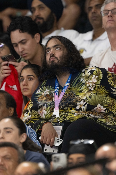 Exclusif - Anant Ambani avec sa femme et toute sa famille (Radhika Anant Ambani sa femme, Mukesh Ambani son pere, et sa mere Nita Ambani) - Célébrités assistent aux épreuves de gymnastique lors des Jeux Olympiques de Paris 2024 (JO) au Palais omnisports Bercy Arena, à Paris, France, le 30 juillet 2024. © Jacovides-Perusseau/Bestimage Exclusive - Anant Ambani with his wife and his entire family (Radhika Anant Ambani his wife, Mukesh Ambani his father, and his mother Nita Ambani) attend the gymnastics events during the Paris 2024 Olympic Games (Olympics) at Palais Omnisports Bercy Arena in Paris on July 30, 2024.
