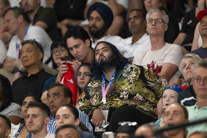 Exclusif - Anant Ambani avec sa femme et toute sa famille (Radhika Anant Ambani sa femme, Mukesh Ambani son pere, et sa mere Nita Ambani) - Célébrités assistent aux épreuves de gymnastique lors des Jeux Olympiques de Paris 2024 (JO) au Palais omnisports Bercy Arena, à Paris, France, le 30 juillet 2024. © Jacovides-Perusseau/Bestimage Exclusive - Anant Ambani with his wife and his entire family (Radhika Anant Ambani his wife, Mukesh Ambani his father, and his mother Nita Ambani) attend the gymnastics events during the Paris 2024 Olympic Games (Olympics) at Palais Omnisports Bercy Arena in Paris on July 30, 2024.