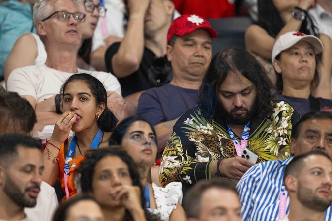 Exclusif - Anant Ambani avec sa femme et toute sa famille (Radhika Anant Ambani sa femme, Mukesh Ambani son pere, et sa mere Nita Ambani) - Célébrités assistent aux épreuves de gymnastique lors des Jeux Olympiques de Paris 2024 (JO) au Palais omnisports Bercy Arena, à Paris, France, le 30 juillet 2024. © Jacovides-Perusseau/Bestimage Exclusive - Anant Ambani with his wife and his entire family (Radhika Anant Ambani his wife, Mukesh Ambani his father, and his mother Nita Ambani) attend the gymnastics events during the Paris 2024 Olympic Games (Olympics) at Palais Omnisports Bercy Arena in Paris on July 30, 2024.