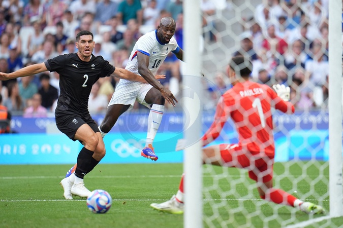 Jean-Philippe Mateta (France), Michael Boxall (New Zealand) and Alex Paulsen (New Zealand), Football , France vs New Zealand during the Olympic Games Paris 2024. Photo Norbert Scanella - DPPI Media / Panoramic