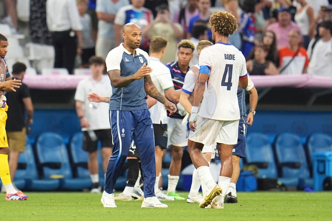 End of the match Thierry Henry (sélectionneur de l'équipe de France) and Loïc Badé (France), Football , France vs New Zealand during the Olympic Games Paris 2024. Photo Norbert Scanella - DPPI Media / Panoramic