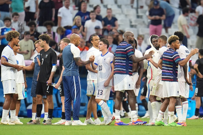 End of the match Thierry Henry (sélectionneur de l'équipe de France) and Joris Chotard (France), Football , France vs New Zealand during the Olympic Games Paris 2024. Photo Norbert Scanella - DPPI Media / Panoramic