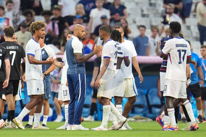 End of the match Thierry Henry (sélectionneur de l'équipe de France) and Andy Diouf (France), Football , France vs New Zealand during the Olympic Games Paris 2024. Photo Norbert Scanella - DPPI Media / Panoramic
