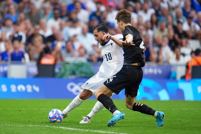 Rayan Cherki (France) and Tyler Bindon (New Zealand), Football , France vs New Zealand during the Olympic Games Paris 2024. Photo Norbert Scanella - DPPI Media / Panoramic