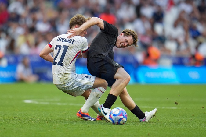 Lachlan Bayliss (New Zealand) and Johann Lepenant (France), Football , France vs New Zealand during the Olympic Games Paris 2024. Photo Norbert Scanella - DPPI Media / Panoramic