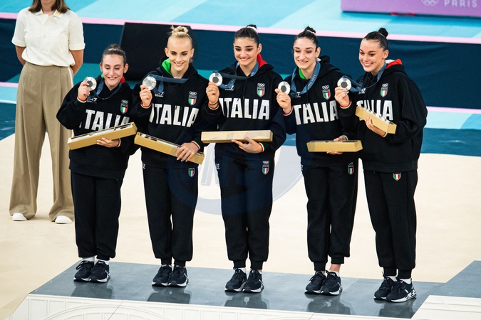 Manila Esposito, Alice D'Amato, Angela Andreoli, Giorgia Villa and Elisa Iorio (ITA) - Gymnastique Artistique - Artistic Gymnastics, Podium Silver Medal Women's Team Artistic Gymnastics event, during the Olympic Games Paris 2024